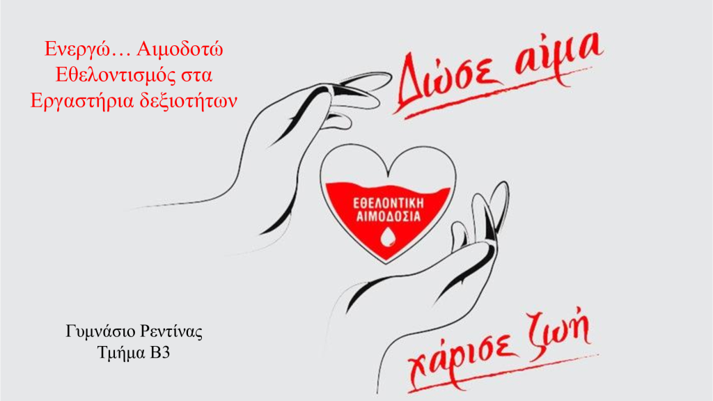 Στο πλαίσιο του μαθήματος Εργαστήρια Δεξιοτήτων της Β΄ Γυμνασίου, οι μαθητές και οι μαθήτριες του Γυμνασίου Ρεντίνας ασχολήθηκαν με το θέμα της εθελοντικής αιμοδοσίας και της δωρεάς μυελού των οστών. Συγκέντρωσαν πληροφορίες από την ιστοσελίδα του Εθνικού Κέντρου Αιμοδοσίας και δημιούργησαν ένα podcast με τίτλο “Ενεργώ … Αιμοδοτώ”